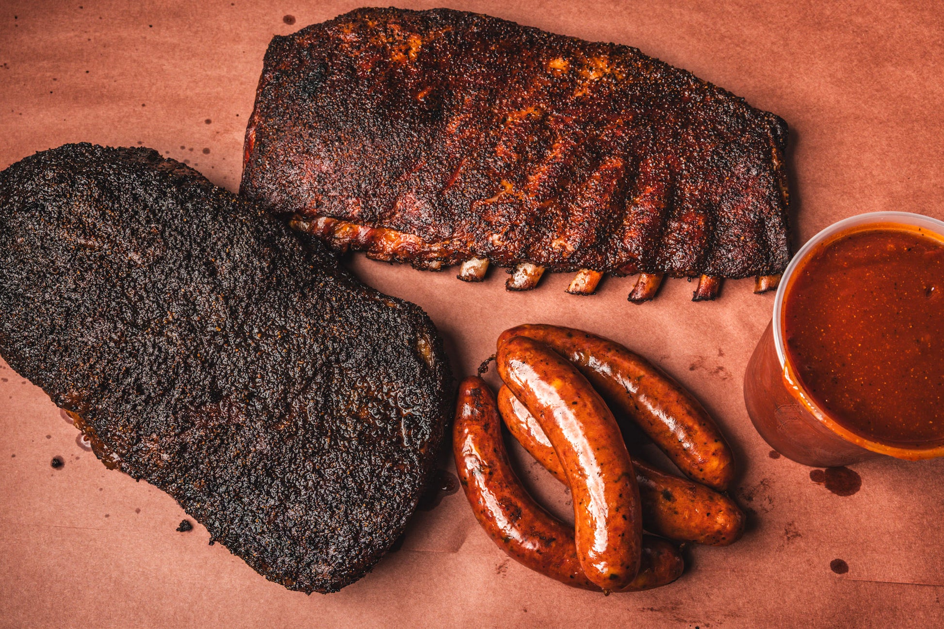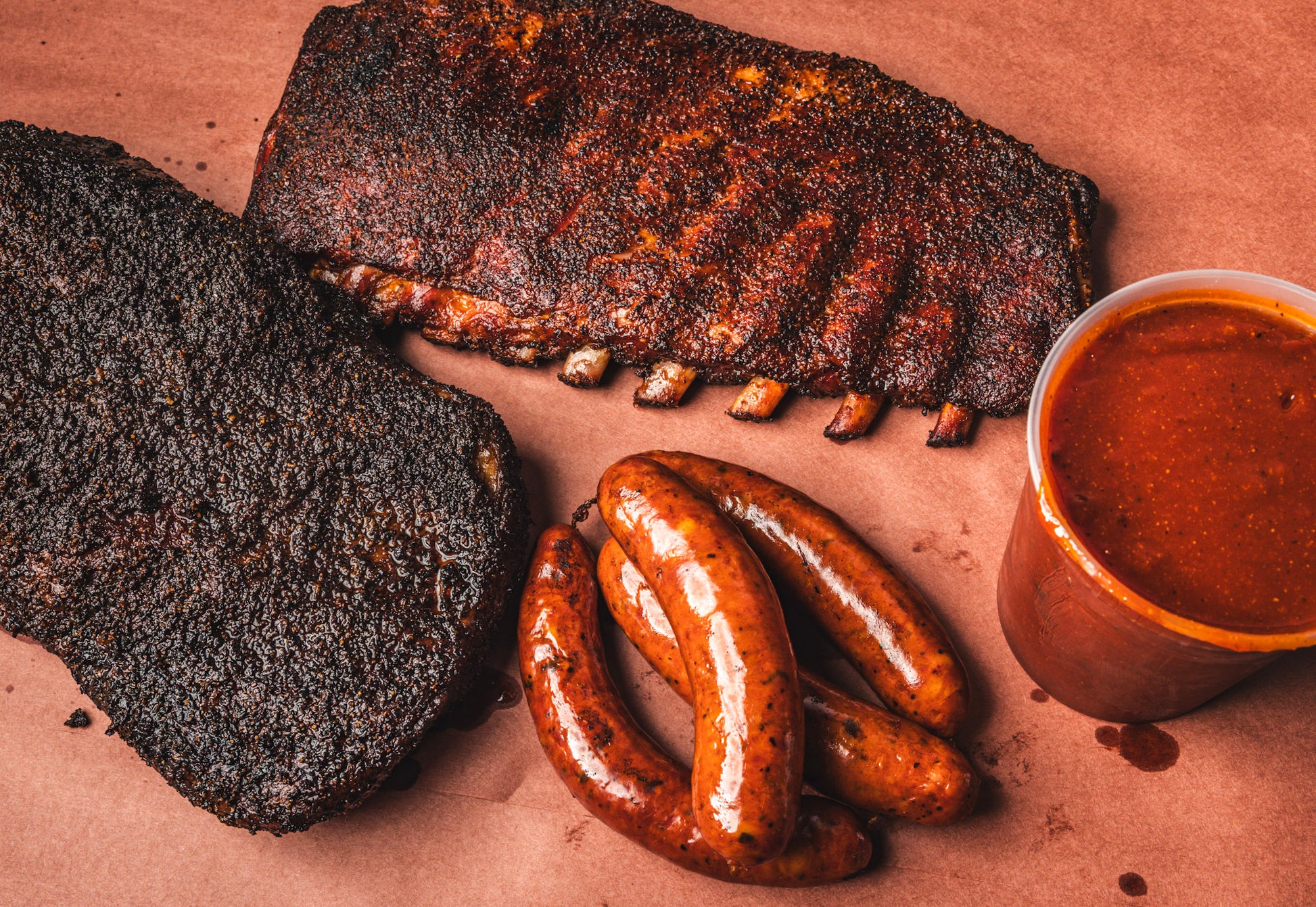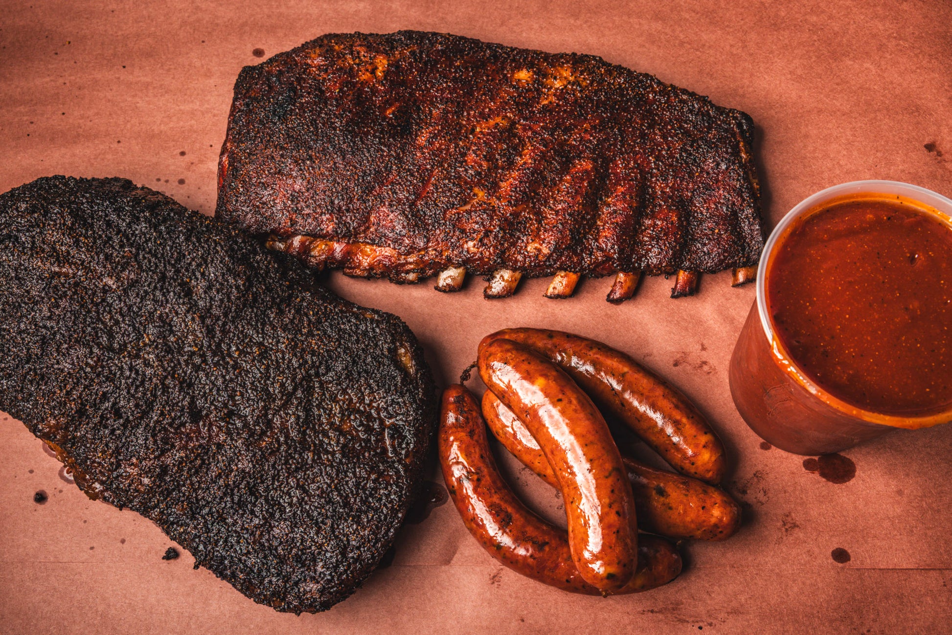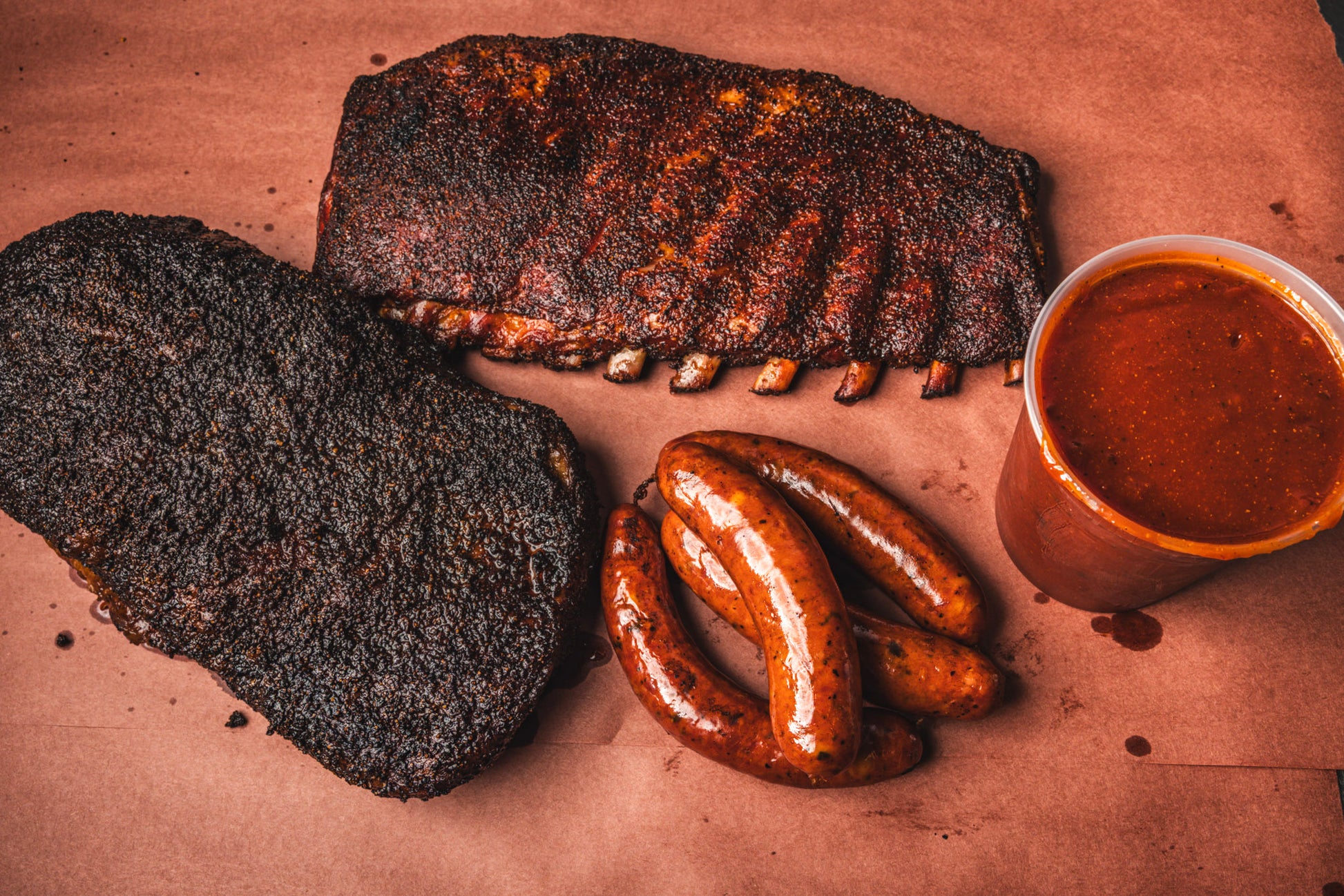 Let's have a feast with the Texas Trinity! Get yourself a whole brisket, a rack of pork spare ribs, 4 sausage links and your choice of sauce!
